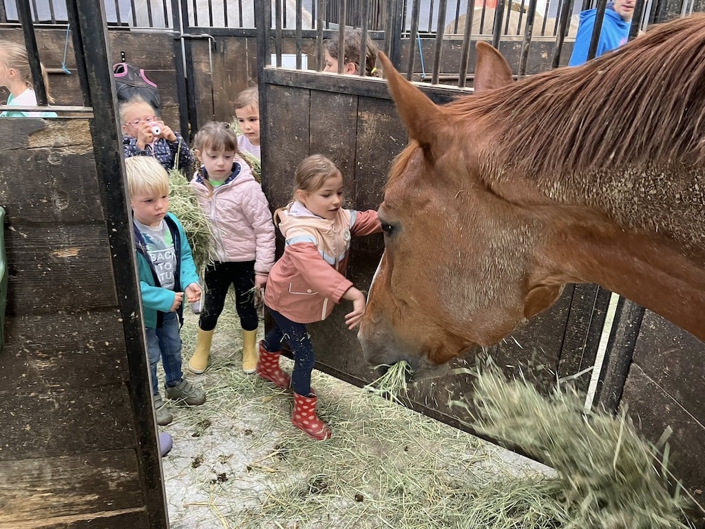 Sur le parking, un va-et-vient de voitures, malgré l’heure matinale. Des enfants en sortent, certains sont encore mal éveillés. Avec papa ou maman venus les accompagner, ils longent un mur de béton décoré de dessins réalisés la veille à la craie. Les voici accueillis par Guillaume Joiret et Cindy de Voghel. Lui est né sur place, son épouse a grandi dans un manège, entourée de chevaux. Et tous deux sont des enseignants passionnés autant par leur travail à l’école que par le quotidien de la ferme, le contact avec les animaux et tout ce que la nature peut apporter comme leçons de vie.